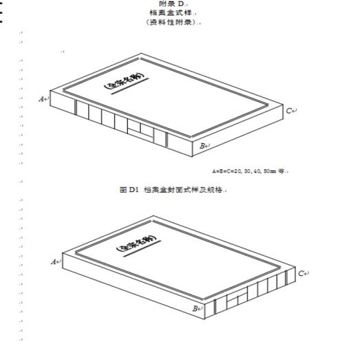 6.4.1.1 档案盒封面应标明全宗名称。档案盒的外形尺寸为310mm×220mm(长×宽),盒脊厚度可以根据需要设置为20 mm、30mm、40mm、50mm等(见附录D 图D1)。