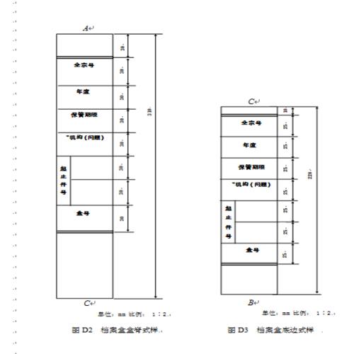 6.4.1.2 档案盒应根据摆放方式的不同,在盒脊或底边设置全宗号、年度、保管期限、起止件号、盒号等必备项,并可设置机构(问题)等选择项(见附录D 图D2、图D3)。其中,起止件号填写盒内第一件文件和最后一件文件的件号,起件号填写在上格,止件号填写在下格;盒号即档案盒的排列顺序号,按进馆要求在档案盒盒脊或底边编制。